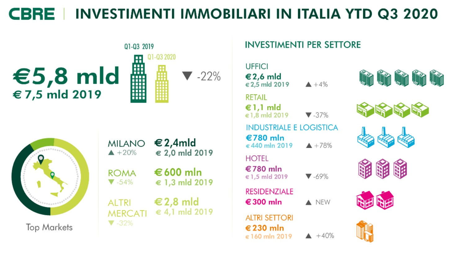 Il volume degli investimenti nel Commercial Real Estate in Italia, nei primi nove mesi dell'anno, è pari a 5,8 miliardi di euro, in lieve calo rispetto allo stesso periodo del 2019, anno record per il settore, ma in crescita rispetto al 2018. Nel terzo trimestre del 2020 si sono registrati infatti investimenti per 1,9 miliardi di euro. La componente estera torna a crescere rispetto alla prima metà dell'anno, con quota 60% del totale, pur rimanendo al di sotto della media osservata negli ultimi 5 anni.