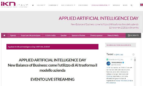 - la seconda edizione di Applied Artificial Intelligence Day - New Balance of Business: come l'utilizzo di AI trasforma il modello azienda, l'unico evento in Italia che dà l'opportunità ai partecipanti di scoprire 17 use case di vero utilizzo di intelligenza artificiale applicabile al business e che quest'anno propone il format ibrido. Grazie alle esperienze raccontate da WindTre, Electrolux, FCA, ENI, TIM, Poste Italiane, Enel, Allianz, Assicurazioni Generali, Flow, Intesa San Paolo, CINECA, GSK e Credem banca, verrà analizzato lo stato di avanzamento di utilizzo dell'AI nei diversi settori produttivi e quali nuovi equilibri si stanno delineando nel mercato italiano.