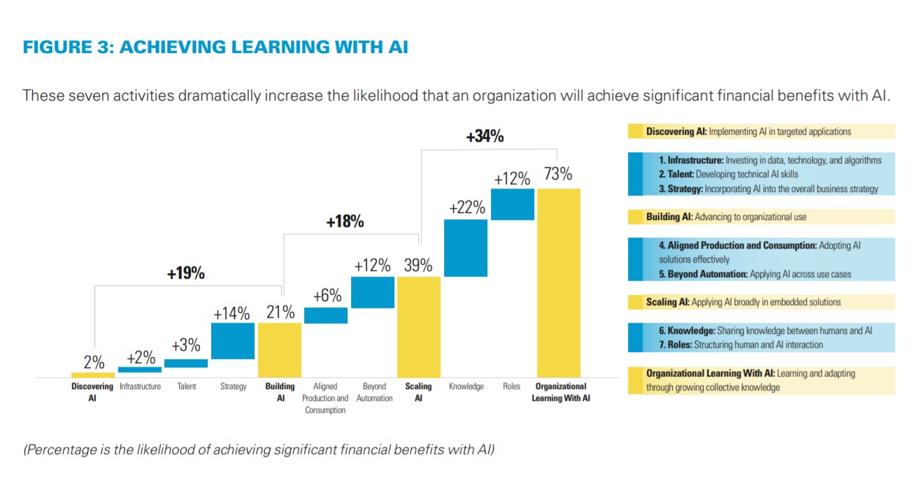 Le organizzazioni che apprendono attraverso l'uso dell'AI hanno in comune tre caratteristiche essenziali: facilitano l'apprendimento sistematico e continuo tra esseri umani e macchine, sviluppano molteplici metodi di interazione tra i due, cambiano per imparare e imparano a cambiare. Il risultato? Anche questo è comune a tutte: investire sistematicamente in queste attività determina l'aumento delle probabilità di generare valore del 73%.