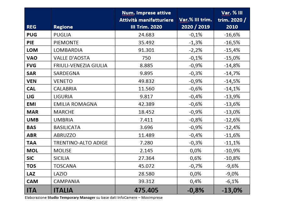 Ritornando ai dati elaborati da Studio Temporary Manager, tra i settori legati all'attività manifatturiera, dal 2010 a oggi, gli unici con il segno positivo sono quelli legati alla "Riparazione, manutenzione ed installazione di macchine ed apparecchiature" (+53% di imprese attive), all'industria delle "Bevande" (+13,4%). Crolla, invece, l'industria del Tabacco (-52,2%), seguita dalla Fabbricazione di prodotti in legno, sughero, paglia, e materiali da intreccio (-28,8%). A livello regionale, a soffrire maggiormente negli ultimi dieci anni sono state la Puglia (-16,6%), il Piemonte (-16,5%), la Lombardia (-15,4%), la Valle d'Aosta (-15%), il Friuli-Venezia Giulia (-14,8%), la Sardegna (-14,7%) e il Veneto (-14,5%). Spostandosi più nel profondo del tessuto territoriale, i cali maggiori nel decennio 2010/2020 riguardano le province di Trieste (-23%), Biella (-21,6%), Varese (-20,7%), Verbano-Cusio-Ossola (-20,1%), Bari (-20%) e Belluno (-19,8%), mentre l'unica provincia che fa eccezione avendo il segno più in Italia è Ragusa (+3,5%).