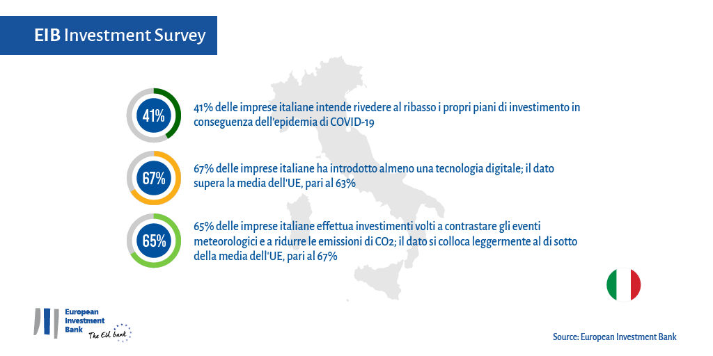 "L'indagine della BEI dimostra che prima dell'epidemia di COVID-19 le imprese italiane stavano investendo nella giusta direzione, con una spesa per l'innovazione superiore a quella della media dell'UE. Ora la pandemia sta frenando gli investimenti e rischia di compromettere la nostra capacità di affrontare le sfide del XXI secolo", ha dichiarato il Vicepresidente della BEI Dario Scannapieco. "C'è bisogno di un'azione congiunta a livello europeo per superare l'incertezza in quanto fattore che condiziona le società italiane più di quelle di altri paesi. È necessario investire ora e guardare oltre la ripresa in un'ottica di transizione climatica e digitale. Il Gruppo BEI è uno dei maggiori investitori europei nel campo dell'innovazione e rappresenta inoltre la 'banca dell'UE per il clima', di conseguenza è in grado di assumere un ruolo importante in relazione a queste sfide e al sostegno necessario per far decollare gli investimenti".