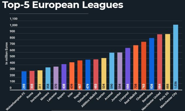 Le prime 20 squadre più costose in Europa sono caratterizzate da grandi club provenienti da tutto il continente, ma è la Premier League inglese ad avere il maggior numero di rappresentanti nella Top 20, con 9 club inclusi nell'elenco. La Serie A ha 4 squadre nella lista. Nell'ordine: Juventus (594 mln), Napoli (467), Inter (439) e Roma (303). La Liga ne ha 3, mentre e Bundesliga e Ligue 1 vantano due rappresentanti ciascuna.