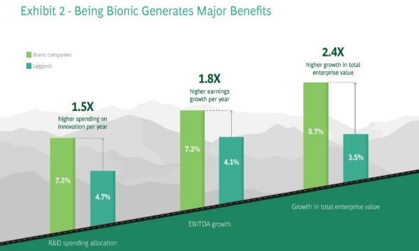Il 10% di algoritmi, il 20% di tecnologia e informatica, il 70% di attività industriale e capitale umano. Questa è la ricetta per un'impresa bionica, secondo l'ultimo studio di Boston Consulting Group (Bcg), dal titolo "How Bionic Companies Translate Digital Maturity into Performance". Bioniche sono quelle società in grado di integrare intelligenza umana e artificiale in un'organizzazione più efficiente, produttiva e innovativa.
