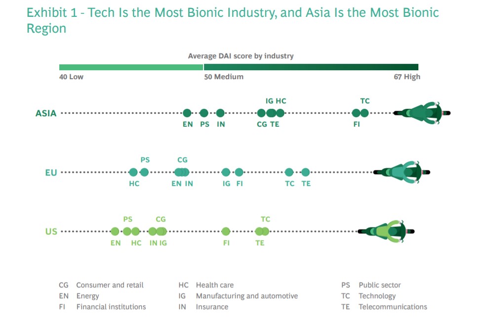 La spinta delle tigri tecnologiche cinesi sta trascinando nell'era bionica tutti i comparti industriali del Paese: dalla finanza alla sanità, dalla manifattura alle assicurazioni. L'Europa ha compiuto progressi, specie nelle telecomunicazioni, ma rimane in ritardo nella digitalizzazione della pubblica amministrazione. Stagnanti, invece, i risultati degli Stati Uniti, polarizzati anche dal punto di vista bionico: i grandi colossi tecnologici americani, per esempio, hanno in media 20 punti DAI in più delle imprese con un giro d'affari annuo entro i 50 milioni di dollari. La buona notizia, però, è che anche le aziende considerate ritardatarie, hanno delineato una strategia per recuperare il distacco.