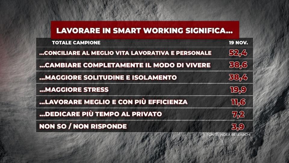 Il 22% degli italiani, secondo la European Working Condition Survey evidenzia che lavora più di 40 ore a settimana e il 9% dei lavoratori almeno una volta al mese deve recarsi in ufficio con scarso preavviso. Le richieste non si traducono però in maggiore flessibilità: il 33% degli intervistati ritiene difficile riuscire a prendersi due ore libere durante l'orario di lavoro per esigenze personali o familiari.