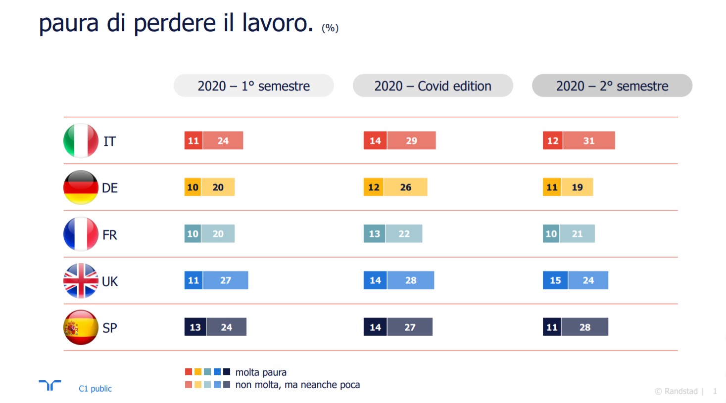 L'emergenza sanitaria ha minato le certezze degli italiani sul lavoro e oggi ben il 43% dei lavoratori teme di perdere il posto o non si sente sicuro del proprio impiego (era il 36% un anno fa), la percentuale più alta tra i principali Paesi europei come Regno Unito (39%), Spagna (39%), Francia (31%) e Germania (30%). Nell'incertezza cresce l'attaccamento all'impiego attuale: il 72% degli italiani si dice soddisfatto del proprio lavoro, +3% rispetto a dodici mesi fa, mentre scende la percentuale di insoddisfatti (dal 10% al 6%) e solo il 9% sta cercando attivamente una nuova posizione (contro il 12% di fine 2019). Cala di dieci punti (dal 58% al 48%) l'ambizione di avviare un'attività, al penultimo posto davanti solo ai francesi (38%) e dopo inglesi (54%), spagnoli (51%), e tedeschi (50%).