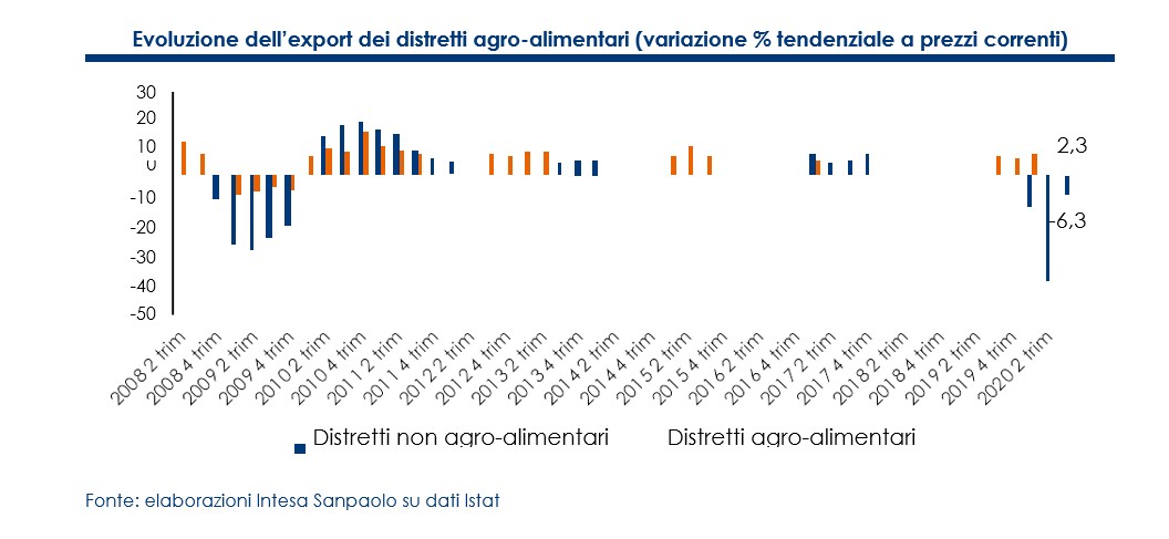 Secondo il Monitor dei Distretti Agroalimentari a cura della Direzione Studi e Ricerche di Intesa Sanpaolo, nel terzo trimestre del 2020 i distretti agroalimentari italiani continuano il sentiero di crescita già intrapreso nella prima metà dell'anno, realizzando nel complesso oltre 5 miliardi di euro di vendite all'estero (corrispondenti a una crescita del 2,3% rispetto allo stesso periodo del 2019). Si tratta ancora una volta di una cifra record per le esportazioni distrettuali agroalimentari italiane, che mai avevano superato i 5 miliardi nel trimestre estivo.