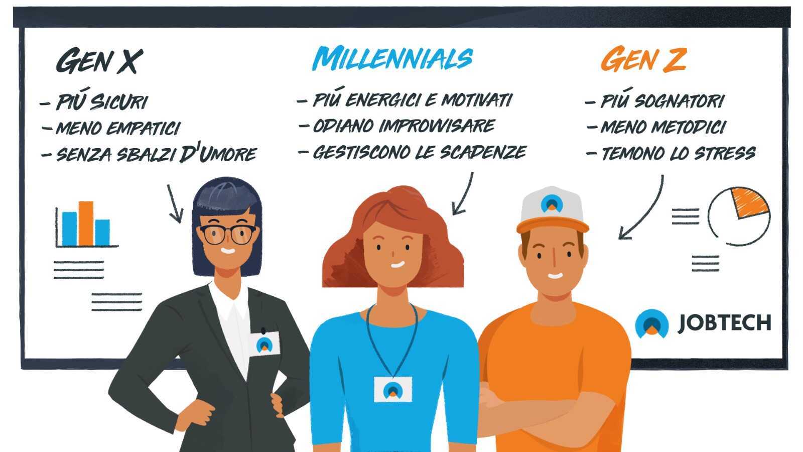 Secondo un'analisi di Jobtech, agenzia per il lavoro digitale, a fasce d'età diverse corrispondono attitudini e peculiarità più marcate: mentre i Millennials sono più metodici e amanti del lavoro in team, i più giovani, nella cosiddetta Generazione Z, si rivelano più flessibili ma insicuri sul lavoro.