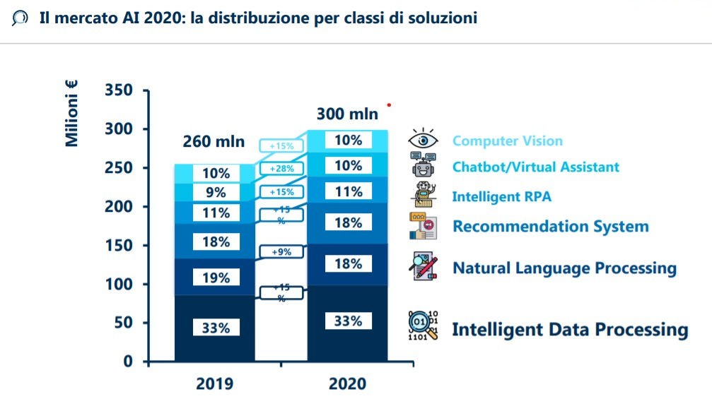 Il restante 20% del mercato è suddiviso equamente fra Chatbot e Virtual Assistant (10%), che sono i progetti con la crescita più significativa (+28%), e le iniziative di Computer Vision (10%, +15%), che analizzano il contenuto di un'immagine in contesti come la sorveglianza in luoghi pubblici o il monitoraggio di una linea di produzione.