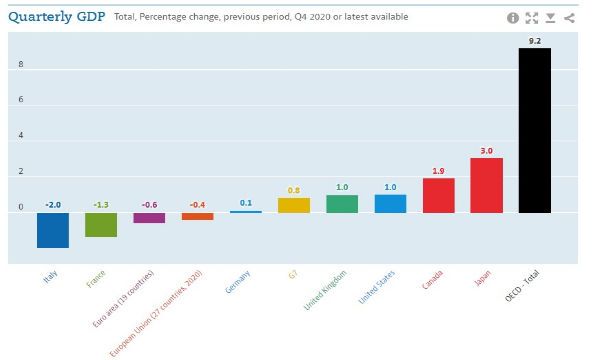 Per le principali sette economie nel complesso, la crescita del PIL è rallentata allo 0,8% nel quarto trimestre del 2020, con andamenti piuttosto divergenti tra i Paesi. Va ricordato che la Cina non fa parte dei Paesi OCSE.