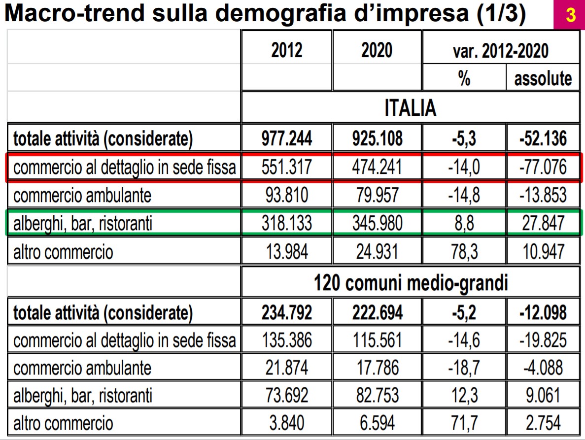 Abbiamo considerato più di 10 anni, ma consideriamo gli ultimi dieci anni di demografia d'impresa nei centri storici per praticità. Demografia d'impresa vuol dire il tessuto produttivo, cioè tre grandi elementi economici: commercio fisico, con sede fissa e ambulante e poi alberghi, bar e ristoranti. Abbiamo provato a fare la distinzione tra centro storico e non perché le dinamiche possono essere differenti, i problemi possono essere differenti. In generale, dal 2012 al 2020 abbiamo perso circa 77 mila negozi del commercio in sede fissa, a cui si aggiungono 14.000 ambulanti, mentre sono cresciuti di 27.000 unità gli alberghi, i bar e i ristoranti.