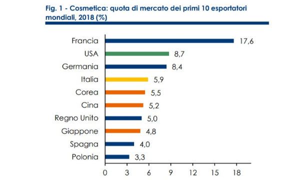 Dalle elaborazioni realizzate sui dati CEPII-BACI emerge l'elevata competitività italiana sui mercati esteri: nella classifica internazionale l'Italia ha guadagnato una posizione in dieci anni, salendo al quarto posto con una quota di mercato pari al 5,9%, grazie soprattutto ai progressi sperimentati nell'alta qualità, dove siamo al 6,6%, 1,3 punti percentuali in più rispetto a dieci anni prima. Si tratta di risultati non casuali. La cosmetica italiana presenta un'intensità di ricerca e sviluppo pari al 6% e ha mantenuto alto il suo impegno sul fronte dell'innovazione anche nel corso della crisi: il 40% delle imprese nel secondo semestre del 2020 dichiara di aver aumentato gli investimenti in ricerca e sviluppo (fonte: Cosmetica Italia). La capacità innovativa, infatti, è uno dei punti di forza del settore, insieme agli alti standard qualitativi, alla flessibilità e all'adattamento al contesto.