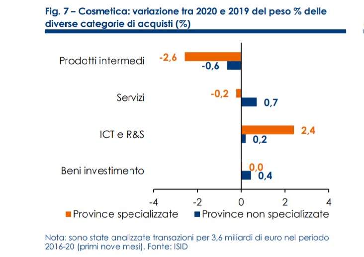 E' stata premiante la presenza in Italia di filiere di fornitura complete e radicate nel settore della cosmetica. Secondo le elaborazioni della Direzione Studi e Ricerche di Intesa Sanpaolo, nel 2019 l'80% degli acquisti di prodotti intermedi nel settore interessava fornitori strategici, ovvero fornitori che tra il 2016 e il 2020 hanno interagito con il committente almeno quattro anni su cinque: questa quota era pari al 71% nel 2016. Per quanto riguarda gli acquisti di servizi, la quota di fornitori strategici è salita al 66%, dodici punti percentuali in più rispetto a tre anni prima. Le partnership strategiche sono spesso di prossimità e ben radicate a livello locale: sono 143 i chilometri di distanza dei fornitori strategici di beni intermedi (40 Km in meno rispetto alle forniture occasionali) e 85 i chilometri dei fornitori strategici di servizi (vs 100 Km di quelli occasionali).