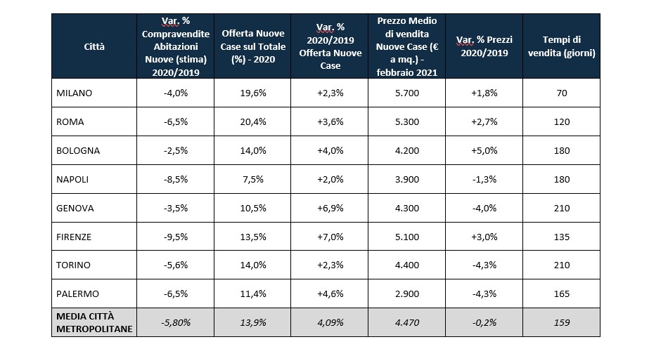 Nelle 8 città analizzate, le nuove abitazioni (oltre 13.350 transazioni nel 2020 e -5,8% sul 2019), hanno resistito meglio rispetto all'usato alla fase negativa del mercato, bloccato di fatto per quasi due mesi. Per quanto riguarda l'anno in corso si prevede una crescita del mercato immobiliare residenziale a livello generale (nuovo e usato) con le nuove abitazioni che segneranno un +6,6% di compravendite e +1,2% dei prezzi.