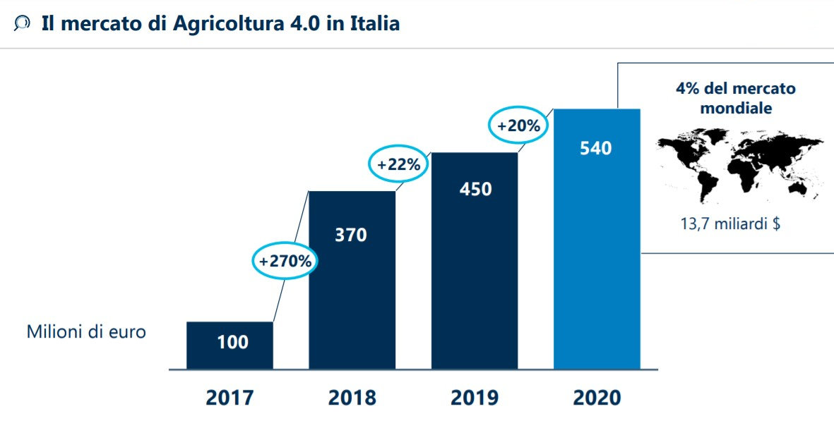 L'emergenza da COVID-19, soprattutto durante il primo lockdown, ha rallentato il mercato dell'Agricoltura 4.0, che però è ripartito di slancio nella seconda parte dell'anno, raggiungendo un valore di 540 milioni di euro nel 2020 (circa il 4% del mercato globale) e registrando una crescita del 20% rispetto all'anno precedente, in linea con l'andamento pre-pandemia.