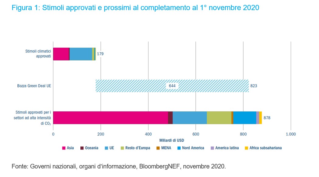 La Cina, il Giappone, la Corea del Sud, gli Stati membri dell'Unione europea e il Regno Unito si sono tutti impegnati a raggiungere l'obiettivo delle emissioni nette pari a zero. I finanziamenti per i progetti green e le misure di sostegno destinate ai settori ad alta intensità di carbonio approvati al 1° novembre 2020 hanno superato i 1.000 miliardi di dollari, e l'UE sta valutando lo stanziamento di altri 644 miliardi di dollari (Figura 1). Con l'insediamento del presidente Biden, anche gli Stati Uniti dovrebbero essere in procinto di varare un imponente pacchetto di stimoli ecologici. La decisione immediata del neopresidente di riportare il Paese dentro l'Accordo di Parigi sul clima denota chiaramente la linea futura degli Stati Uniti.