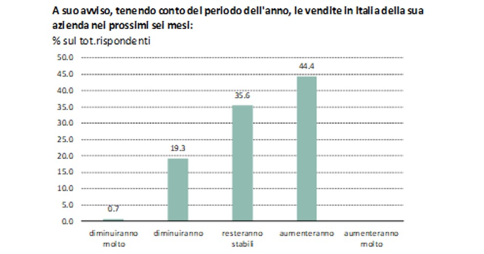 Ordinativi - Tenendo conto del periodo dell'anno, il 41% dei rispondenti giudica normale l'attuale livello del portafoglio ordini; il 28% lo colloca al di sopra dell'ordinario; il 30% inferiore. Le previsioni per i prossimi sei mesi sono di incremento per il 44% dei manager; di stabilità per il 36% e di diminuzione per il 20%.