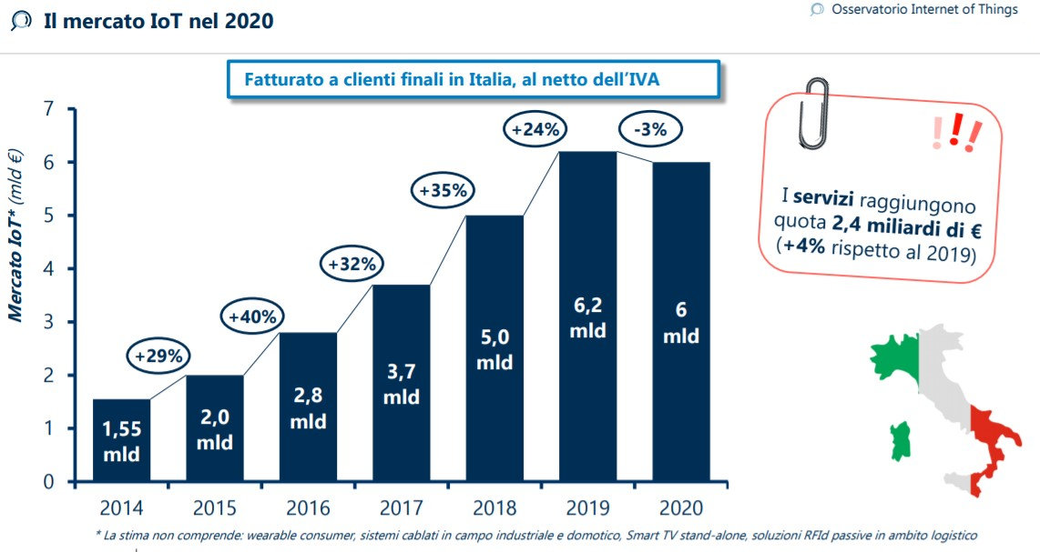 La pandemia di coronavirus ha di fatto frenato la crescita dell'Internet of Things, che negli ultimi anni era stata molto rapida (+24% nel 2019, +35% nel 2018). C'è da dire che, nonostante tutto, il mercato italiano ha retto l'urto del COVID-19, segnando una flessione limitata al 3%, in linea con l'andamento registrato nei principali Paesi occidentali (che oscilla fra il -5% e il +8%), e attestandosi su un valore di 6 miliardi di euro.
