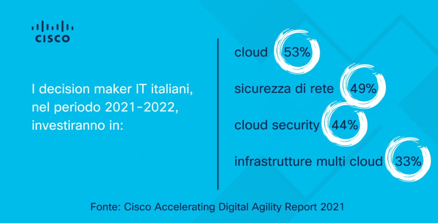 Adesso, i leader IT devono cercare di massimizzare gli investimenti fatti nel 2020 e di conseguenza, a livello mondiale, il 56% nel periodo 2021-22 andrà a investire in applicazioni cloud e/o in sicurezza della rete (rispettivamente 53% e 49% in Italia) il 51% nella sicurezza del cloud (44% Italia) e il 45% nell'infrastruttura multi-cloud (33% il dato del nostro paese).