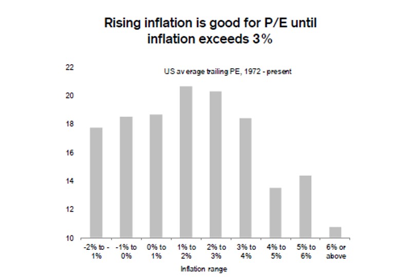 Per le azioni la risposta presenta dei distinguo. Il grafico indica che un aumento dell'inflazione è positivo per i multipli P/E, almeno fino a un certo punto.