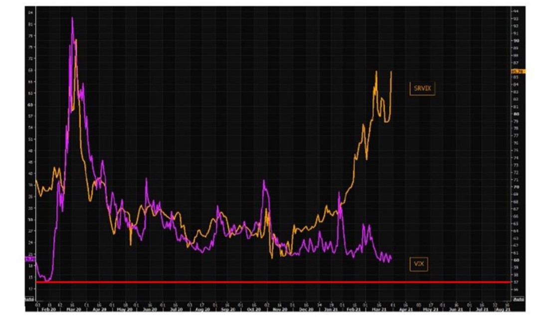 Da un lato, abbiamo il Cboe Interest Rate Swap Volatility Index (in arancione: SRVIX), ovvero un indice che fornisce una misura standardizzata della volatilità rilevata nel mercato OTC (Over-The Counter) degli swap sui tassi di interesse USA, ovvero una stima di riferimento per il comparto obbligazionario statunitense. Ebbene, segnaliamo come l'indice abbia registrato una crescita significativa da inizio anno al 31 Marzo, con un +35% circa, e dal grafico possiamo osservare addirittura che si sta avvicinando ai livelli massimi toccati in Marzo 2020, allo scoppio della pandemia.