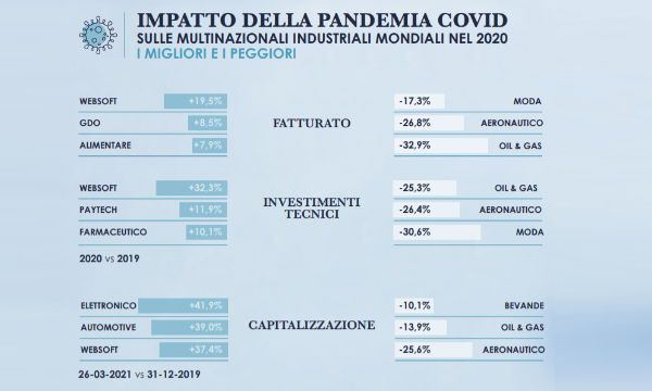 Il giro d'affari delle maggiori multinazionali mondiali è mediamente in contrazione del 3,1% rispetto al 2019, con ampia divergenza fra i settori. Si distinguono i gruppi del WebSoft che continuano a crescere (+19,5%), seguiti a distanza dalla GDO (+8,5%), dall'Alimentare (+7,9%), dall'Elettronica (+5,4%) e dalle case farmaceutiche (+3,0%). Le Telecomunicazioni e l'industria dei Pagamenti Digitali mostrano una certa resilienza, con ricavi tendenzialmente stabili (rispettivamente -0,6% e -0,7%), mentre sono in sofferenza i colossi dell'Oil&Gas (-32,9%), i produttori di aeromobili (-26,8%), i gruppi della Moda (-17,3%) e dell'Automotive (-12,1%).