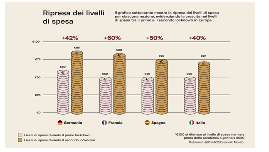 - La Germania è in testa anche per quanto riguarda la ripresa dei livelli di spesa dei consumatori, seguita da Francia, Spagna e, infine, Italia.