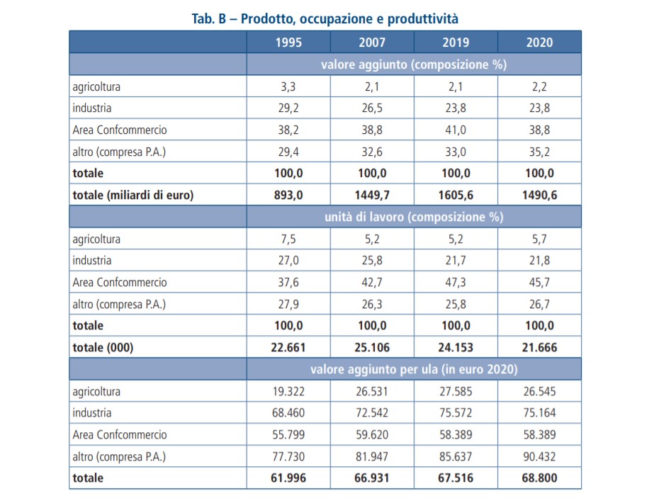 Fino al verificarsi della pandemia, che ha quasi azzerato pezzi considerevoli dei servizi market, il terziario al netto del comparto della P.A. ha rappresentato l'unico canale di sbocco occupazionale in grado di inserire forza lavoro nei suoi processi produttivi, a differenza degli altri segmenti di agricoltura e industria che hanno migliorato il quoziente tra valore aggiunto e unità di lavoro prevalentemente in virtù di una riduzione delle seconde: tra il 1995 e il 2019, l'agricoltura ha perso 433mila unità di lavoro, l'industria 877mila mentre l'Area Confcommercio ne ha guadagnate 2,9 milioni, determinando l'intera crescita dell'occupazione del sistema economico (+1,5 milioni circa).