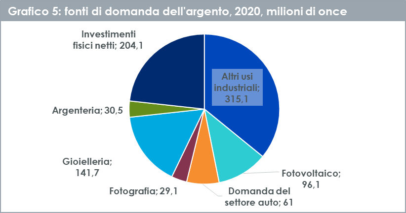 Poiché si focalizza sulle fonti di energia rinnovabili, l'argento è una componente essenziale del fotovoltaico (pannelli solari). Circa il 10% (96 milioni di once) di tutti gli usi dell'argento nel 2020 ha riguardato il fotovoltaico e il suo impiego in questa categoria è raddoppiato dal 2014. Viene usato più argento nel fotovoltaico che nelle categorie di argenteria e fotografia messe assieme. In considerazione dell'impegno a raggiungere emissioni zero entro il 2050 da parte di Unione Europea, Stati Uniti, Giappone, Corea del Sud, nonché di intenti analoghi espressi dalla Cina per il 2060, ci aspettiamo che l'uso del fotovoltaico si espanda. Nonostante la tendenza alla parsimonia - impiegare minori quantità d'argento per ciascuna applicazione solare - ci aspettiamo che il volume delle installazioni solari si espanda aggressivamente nei prossimi decenni, date le aspirazioni al rinnovabile.