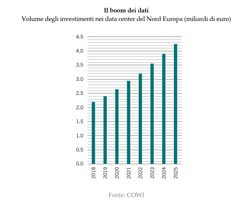 Non è un caso che l'investimento nei data center nei Paesi nordici sia quasi raddoppiato tra il 2018 e il 2025 (si veda il grafico). Di fondamentale importanza è anche il fatto che la regione sia dotata di reti in fibra ottica ultraveloci, le autostrade del mondo digitale, che utilizzano cavi costituiti da fili di fibra di vetro sui quali i dati vengono trasferiti sotto forma di luce ottica.