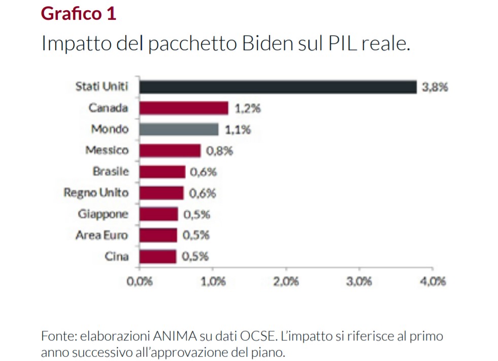Per il team Investment Research & Advisory di Anima, infatti, il flusso di dati su scala globale continua a confermare uno scenario di forte incremento della crescita: l'economia globale è destinata ad espandersi ad un ritmo del 6,5%/7,0%, il più rapido da decenni. A fare da traino saranno soprattutto gli Stati Uniti e la Cina. In particolare, sono quattro i driver di una crescita così forte: in primis, lo stimolo fiscale approvato dal governo statunitense. L'OCSE, a proposito, stima che i benefici saranno significativi anche per gli altri Paesi, specie per i partner commerciali (si veda il Grafico 1).