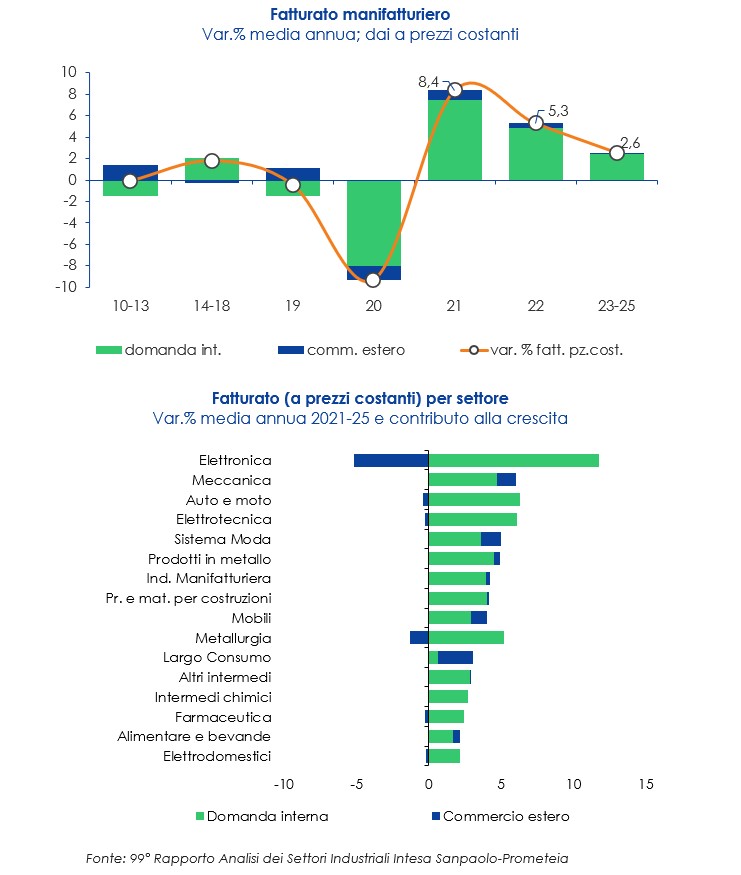Il rimbalzo atteso nel biennio 2021-22 (+8,4 nel 2021 e +5,3 nel 2022, a prezzi costanti) e la spinta dei prezzi porteranno il fatturato manifatturiero a superare la soglia dei 1000 miliardi di euro; nel periodo 2023-25, i ritmi di crescita, pur rallentando, si manterranno sostenuti (+2,6% in media d'anno, a prezzi costanti).
