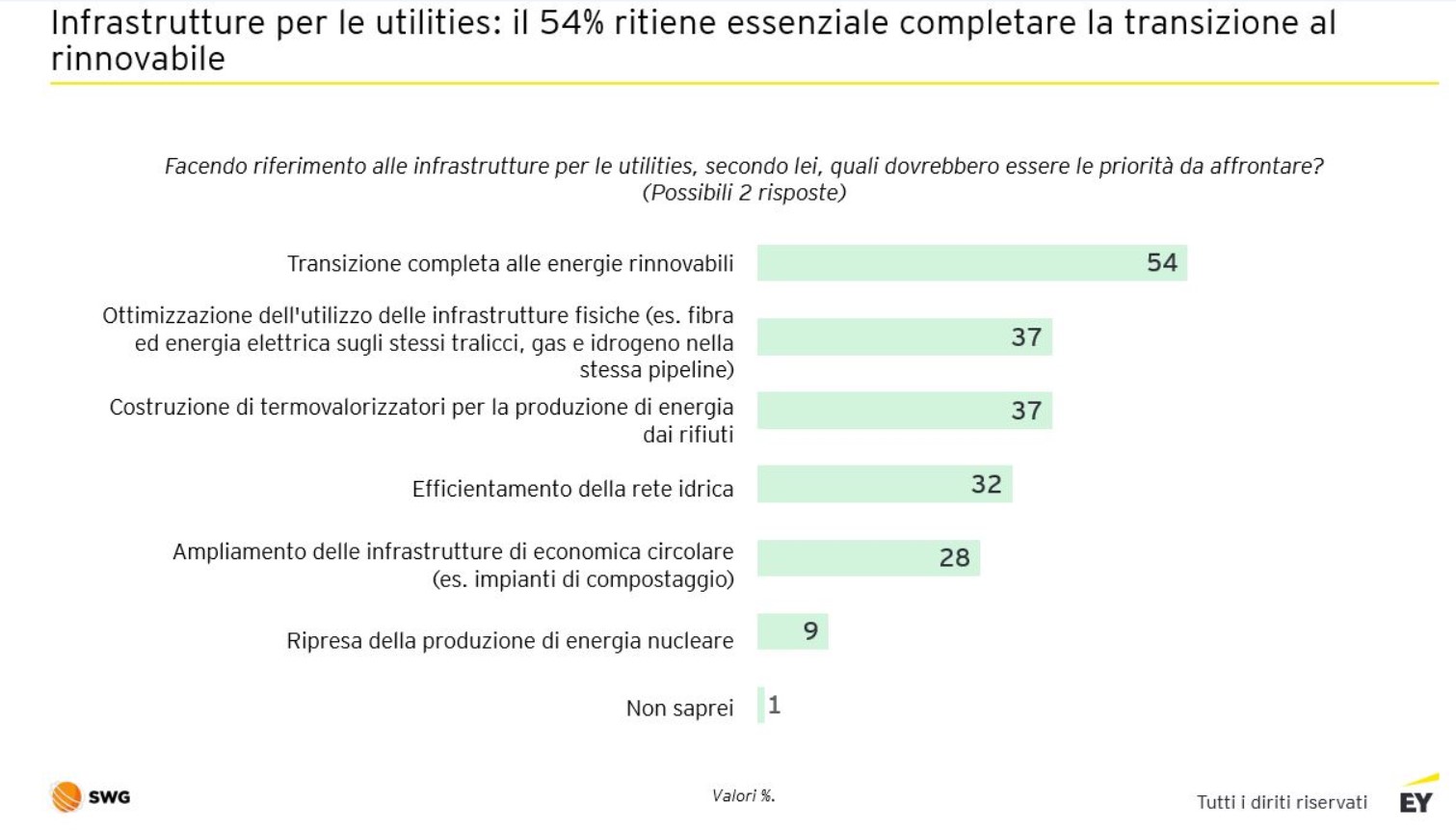 L'Italia registra già un buon livello di sviluppo nella transizione energetica grazie alla proattività di alcuni grandi attori del settore e al supporto di una legislazione incentivante, oltre che di una risposta positiva dell'intera filiera, utenza inclusa. Infatti, sul tema delle infrastrutture per le utilities, tra le priorità degli intervistati primeggia la transizione completa alle energie rinnovabili (54%), seguita dall'ottimizzazione dell'utilizzo delle infrastrutture fisiche, come la fibra, l'energia elettrica sugli stessi tralicci e l'unione di gas e idrogeno nella stessa pipeline (37%), e dalla costruzione di termovalorizzatori per la produzione di energia dai rifiuti (sempre 37%). Infine, un 32% pone l'accento sulla necessità di rendere più efficiente la rete idrica.