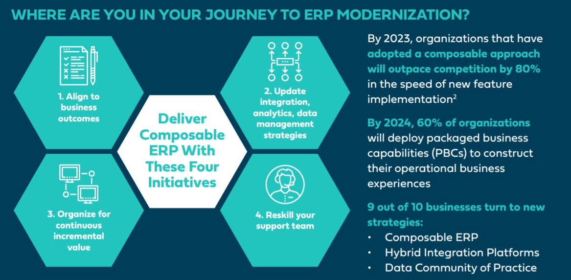 Il Composable ERP, nella definizione di Gartner, è una strategia di ERP completamente componibile, cioè che renda possibile estendere le funzionalità grazie all'ecosistema di applicazioni esterne ad esso, e attingendo a fonti dati non tradizionalmente legate all'EPR stesso. Tutto ciò permette di superare i limiti delle applicazioni legacy e modernizzare le proprie attività così da ottenere un vantaggio competitivo sul mercato.