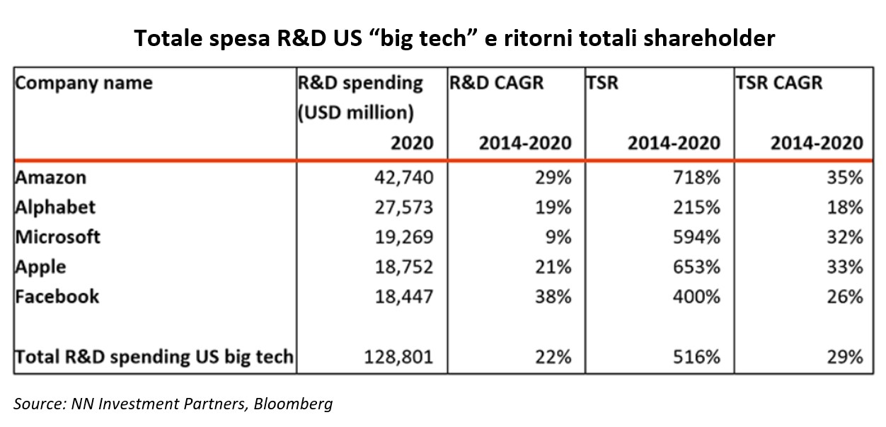 NN IP ritiene che le aziende che investono importanti risorse in ricerca e sviluppo (R&S) spesso diventano più solide e più a lungo perché dà loro un vantaggio competitivo a lungo termine quando è ben mirato. La maggior parte degli studi sulla relazione tra R&S e valore di un'azienda mostrano che la R&S incide positivamente sia sui rendimenti dei titoli azionari che sul valore della società.