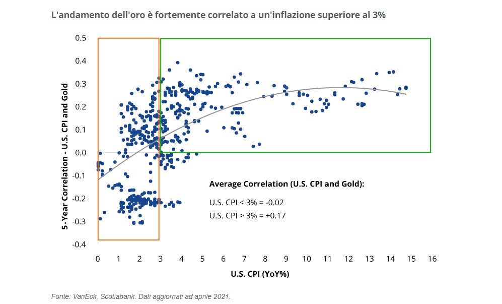 L'oro reagisce all'inflazione quando questa raggiunge livelli eccessivi e/o è fuori controllo. Il grafico mostra che quando la variazione dell'indice dei prezzi al consumo è inferiore al 3% non vi è alcuna correlazione tra oro e CPI. La correlazione diventa sostanzialmente positiva al di sopra del 3%, mentre un trend più lineare si instaura al di sopra del 4%. A maggio i prezzi dell'oro potrebbero aver superato un limite superiore se l'inflazione dovesse protrarsi nel tempo.