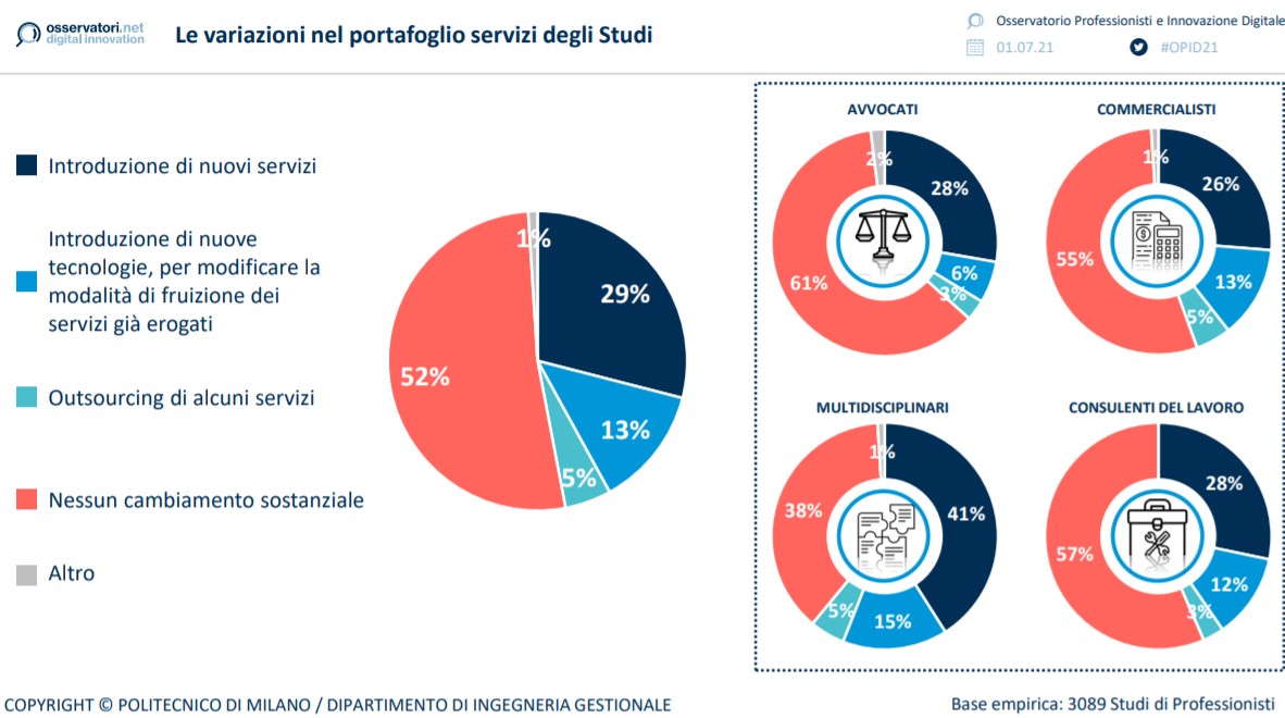 "L'emergenza sanitaria non ha scoraggiato gli studi professionali, anzi ne ha accelerato la trasformazione digitale e organizzativa e ha dato una scossa di consapevolezza anche a quei professionisti che ancora non avevano imboccato la strada della digitalizzazione", afferma Claudio Rorato, Responsabile scientifico dell'Osservatorio Professionisti e Innovazione Digitale. "Circa il 20-25% degli studi che aveva già iniziato da qualche anno il processo di rinnovamento ha avuto conferma della bontà degli investimenti effettuati, riuscendo ad adattarsi con successo a modalità di lavoro e relazioni con la clientela sempre più tech driven e arricchendo il portafoglio clienti. Restano ancora ai margini, invece, i micro studi e quei professionisti che per diverse ragioni anche culturali non riescono ad avviare il rinnovamento, anche dal punto di vista collaborativo".