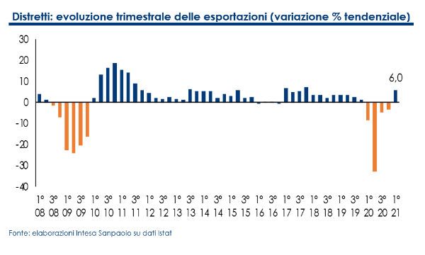 Nei prossimi mesi l'export distrettuale è atteso proseguire il suo percorso di ripresa e molto verosimilmente diversi distretti già al termine del 2021 potranno completare il recupero di quanto perso sui mercati esteri durante la crisi pandemica. Le imprese distrettuali potranno infatti cogliere le opportunità di crescita presenti sui mercati internazionali, dove gli scambi sono in forte accelerazione. L'unica importante eccezione sarà il Sistema moda, penalizzato da una prima parte d'anno ancora condizionata dalla pandemia e una propensione al consumo di beni voluttuari che avrà bisogno di tempo per tornare sui livelli pre-covid.