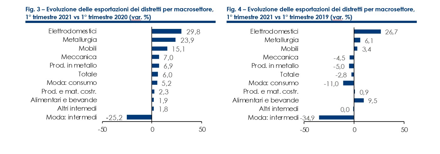 Hanno poi mostrato una buona dinamicità i distretti specializzati nella Metalmeccanica che hanno messo a segno un progresso pari a circa il 7%. Si sono messe in evidenza, riportando risultati migliori rispetto anche al corrispondente periodo del 2019, la Termomeccanica di Padova, la Meccatronica dell'Alto Adige, la Metalmeccanica del basso mantovano, le Macchine agricole di Reggio Emilia e Modena e la Meccanica strumentale di Bergamo. Hanno chiuso il primo trimestre in forte crescita anche i distretti specializzati in Mezzi di trasporto, dove spiccano la Camperistica della Val d'Elsa (+60,5%), la Nautica di Viareggio (173,9%), i Ciclomotori di Bologna (+18,4%) e le Biciclette di Padova e Vicenza (+34,1%), tutti abbondantemente sopra i livelli toccati nei primi tre mesi del 2019, grazie al traino del mercato europeo.