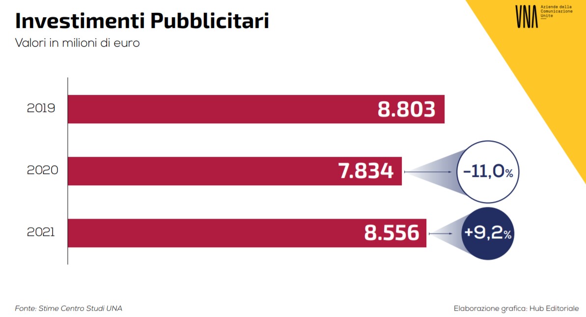 Per gli investimenti media previsioni ottimistiche e in crescita che prevedono la chiusura del 2021 a +9,2% - circa due punti percentuali in più rispetto alle stime di aprile 2021 - con un fatturato che supererà gli 8,5 miliardi di euro. E' quello che emerge da un aggiornamento dei dati elaborati dal Centro Studi UNA - Aziende della Comunicazione Unite. Una rilevazione particolarmente importante che si iscrive in un periodo di forte cambiamento e che fornisce al mercato spunti utili per pianificare e guidare i brand nelle comunicazioni dei prossimi mesi.
