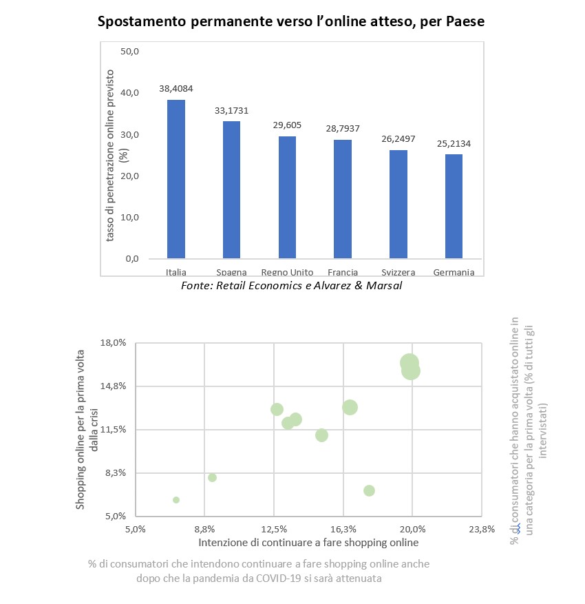 "Va precisato che sono soprattutto i nuovi consumatori - coloro che hanno consolidato i nuovi comportamenti dopo aver superato le barriere iniziali della nuova esperienza (dalla creazione dell'account al settaggio dei metodi di pagamento, dal consolidamento della fiducia alla scoperta della convenienza), quelli che tendono a pensare che il cambiamento sarà irreversibile", spiega Franzone. E questo avviene con più facilità per alcuni settori merceologici come gli elettrodomestici e gli oggetti elettronici in generale che hanno visto uno spostamento verso le vendite online del 18,7%, i casalinghi con il 16% e l'abbigliamento con il 14,2%, i prodotti di lusso, che richiedono un processo di acquisto più ponderato, continuano a presidiare i canali tradizionali. In ogni caso la via verso l'online sembra spianata, solo in Italia si stima che i negozi fisici perderanno nel post-pandemia quasi il 30% dei visitatori, in UK la percentuale sale al 44%.