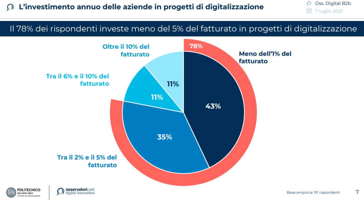 Più precisamente - hanno affermato Paola Olivares, Direttore Osservatorio Digital B2B, Politecnico di Milano e Camillo Loro, Ricercatore Senior Osservatorio Digital B2B, Politecnico di Milano - il 78% delle aziende rispondenti investe meno del 5% del proprio fatturato in progetti di digitalizzazione. I fattori che ostacolano l'implementazione di questi progetti sono diversi, ma in particolare i rispondenti hanno indicato come primarie: l'assenza di una chiara visione sul digitale (35%), resistenze al cambiamento da parte del personale interno (35%) e costi di attivazione troppo elevati (35%).