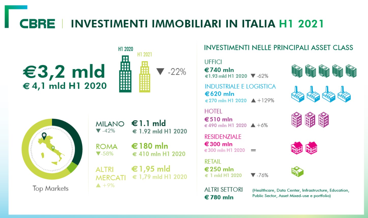 Il volume degli investimenti nel Commercial Real Estate in Italia, nei primi sei mesi dell'anno, è pari a 3,2 miliardi di euro, in calo del 22% rispetto allo stesso periodo del 2020.