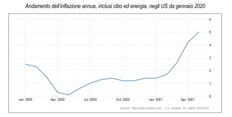 In effetti, negli Stati Uniti a maggio è stata registrata un'inflazione annua del +5%, ben superiore alle aspettative. Mentre la BCE, attendendosi uno sviluppo simile, questa settimana ha portato il target d'inflazione da "inferiore ma vicino al 2%" al 2% simmetrico, mostrandosi più tollerante verso picchi momentanei.