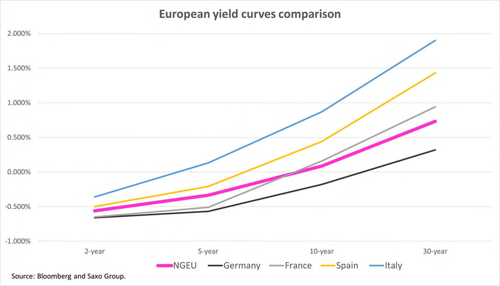Una ricerca di Goldman Sachs sottolinea che uno dei rischi alla base delle obbligazioni NGEU sia la mancanza di protezione da scenari estremi come una rottura della zona euro. Tuttavia, ora che l'UE sta facendo importanti passi in avanti verso una migliore integrazione europea, sembra che questo scenario sia improbabile. Ad ogni modo, i titoli di stato francesi, nella parte anteriore della curva dei rendimenti, sembrano essere una distorsione del mercato provocata dalle politiche della BCE. Proprio per lo stesso motivo, i rendimenti dei titoli di stato greci sono ora inferiori a quelli dell'Italia.