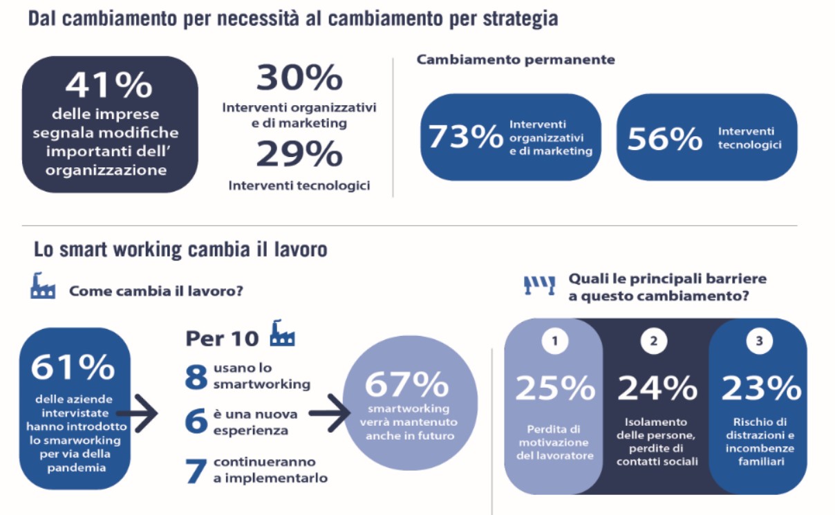 Infatti, il 25% delle aziende teme che lo smartworking possa portare a una perdita di motivazione del lavoratore, mentre il 24% crede che questo porterà a un maggiore isolamento dei dipendenti, con conseguente perdita dei contatti sociali e maggiore preoccupazione per eventuali distrazioni e incombenze famigliari. Solo a seguito di queste motivazioni subentrano i timori riguardo l'impossibilità di adattare i processi aziendali ai nuovi metodi di lavoro. In conclusione, le PMI italiane si dichiarano pronte ad affrontare una revisione dei loro processi a tutto tondo per abbracciare un nuovo stile lavorativo, che offra maggiore libertà ai propri dipendenti e si basi completamente sulla flessibilità e versatilità delle risorse, con nuovi metodi e luoghi di lavoro, un nuovo processo di controllo e maggiore fiducia presso i collaboratori stessi. La digitalizzazione delle proprie realtà è diventata non più un progetto futuro, ma una necessità che si sta avverando, e che la maggior parte delle PMI si sta attrezzando per affrontare al meglio. Nonostante le criticità previste, una buona percentuale sta già attuando dei processi di cambiamento, o comunque pianifica di farlo nel prossimo futuro, segnando una ripresa netta, anche per quelle realtà più piccole e più colpite nell'anno post pandemico.