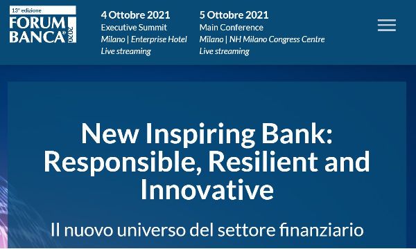 Forum Banca 2021 prenderà il via con l'Executive Summit, l'Invitation Only Session che si svolgerà il 4 ottobre all'Enterprise Hotel di Milano e che tratterà di "Post - pandemic evolution: oltre la trasformazione digitale, verso la finanza sostenibile".