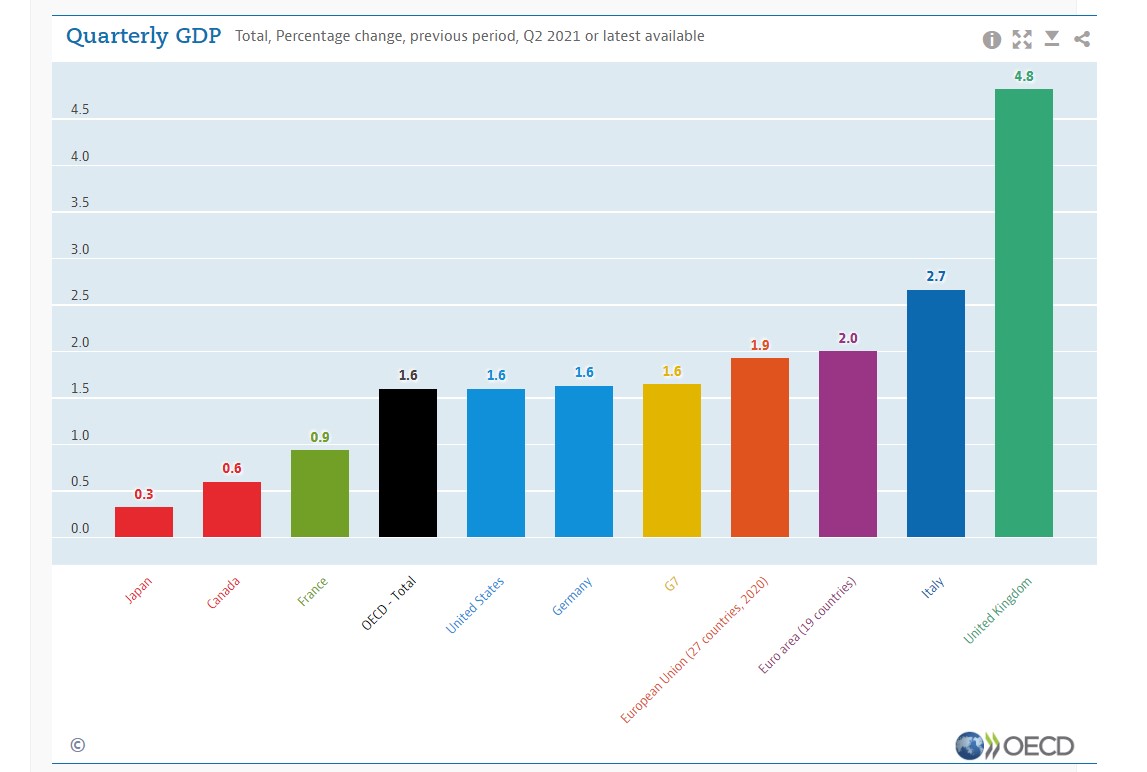 Confrontando l'attività economica nel secondo trimestre del 2021 con i livelli pre-pandemia (4T-2019), il PIL è ancora in ritardo per l'area OCSE nel suo insieme (meno 0,7%). Tra le principali sette economie, UK ha registrato il divario maggiore (meno 4,4%), seguito da Italia (meno 3,8%), Francia e Germania (entrambe a meno 3,3%). Gli Stati Uniti sono l'unica Major Seven Economy che è già tornata ai livelli pre-pandemia nel secondo trimestre del 2021, con il PIL che ha superato il livello pre-pandemia dello 0,8%.