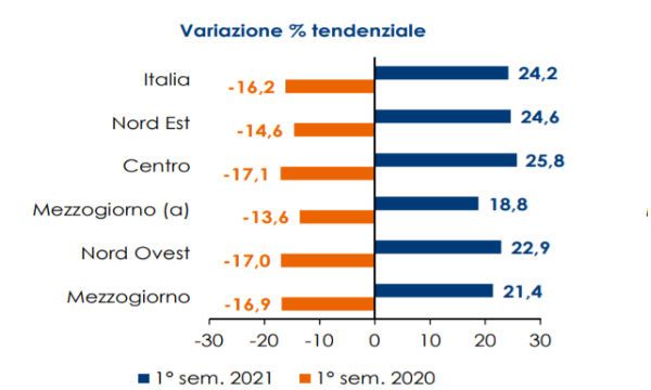 Con un +27,6% il recupero è diffuso a tutti i territori. Tra i settori più dinamici, gli Elettrodomestici, la Metallurgia e l'Agroalimentare. L'anno si prevede chiudersi con nuovi livelli record