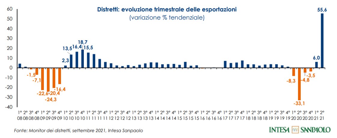 Nel primo semestre del'anno - come emerge dal Monitor dei Distretti Industriali presentato dalla Direzione Studi e Ricerche di Intesa Sanpaolo - l'export dei distretti industriali ha registrato un balzo del 27,6% a prezzi correnti rispetto agli stessi mesi del 2020, fortemente penalizzati dal lockdown primaverile. Il confronto con il 2019 evidenzia un progresso dello 0,7% (pari a 474 milioni di euro) e il raggiungimento di nuovi livelli record a quota 64,6 miliardi di euro.